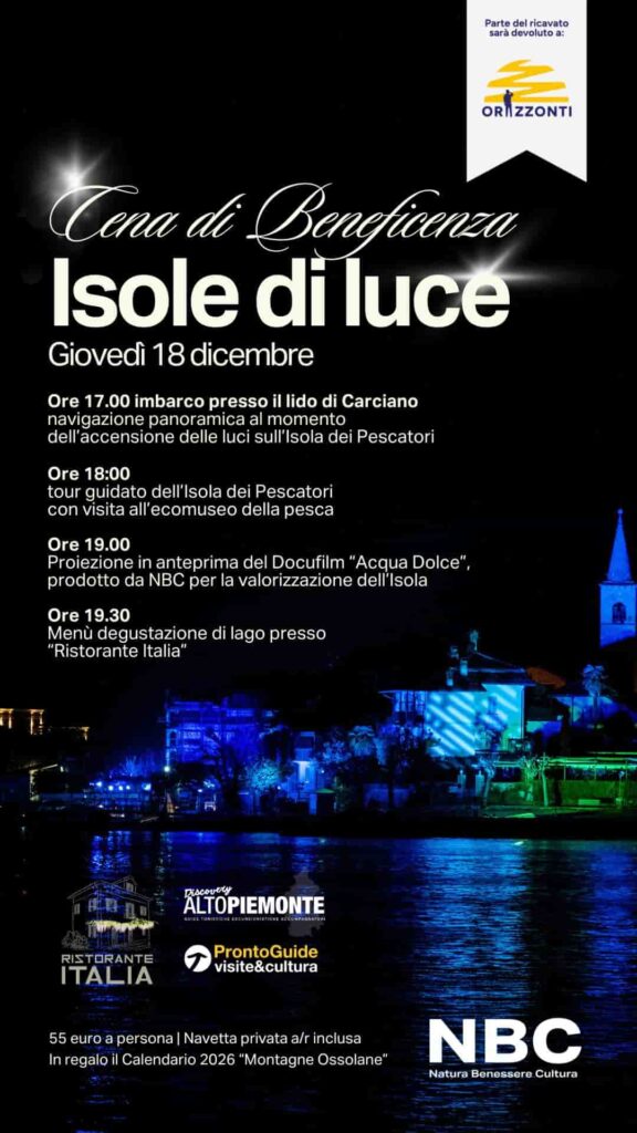 - Programma: navigazione serale tra le Isole di Luce, tour guidato dell’Isola dei Pescatori, ingresso Ecomuseo della Pesca, anteprima docu-film “Acqua dolce – Il pescatore del Lago Maggiore”, cena al Ristorante Italia con menù degustazione di pesce di lago, omaggio Calendario 2026 “Montagne Ossolane” (valore 129 euro) per ogni prenotazione