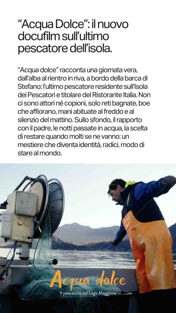 Protagonista è Stefano, uno degli ultimi pescatori (forse l’ultimo) sull’Isola dei Pescatori e titolare del Ristorante Italia, la cui storia personale diventa chiave di lettura di una tradizione in via di scomparsa. A conclusione della serata, pochi passi separano il pubblico dal Ristorante Italia, dove viene servita una cena con menù degustazione di pesce di lago pensato appositamente per l’evento. La sala, affacciata direttamente sul Lago Maggiore, permette di cenare con vista sulle luci dell’isola, mentre in tavola arrivano piatti che interpretano in chiave gastronomica la stessa tradizione raccontata nel museo e nel film, valorizzando il legame tra cucina, paesaggio e mestiere del pescatore.
