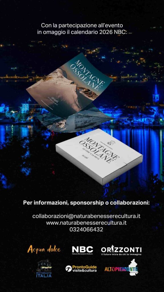 «Per tutti gli invitati abbiamo pensato ad un omaggio: il Calendario 2026 “Montagne Ossolane”». Incluso nel biglietto un oggetto editoriale di pregio che porta nelle case dei partecipanti le immagini delle vette ossolane e, con esse, il messaggio alla base del progetto NBC. In questo modo la serata del 18 dicembre prosegue simbolicamente per dodici mesi, rafforzando l’idea di un’iniziativa che non si esaurisce in una sola notte, ma invita a condividere nel tempo, anche attraverso il passaparola, un diverso modo di vivere e sostenere il territorio.