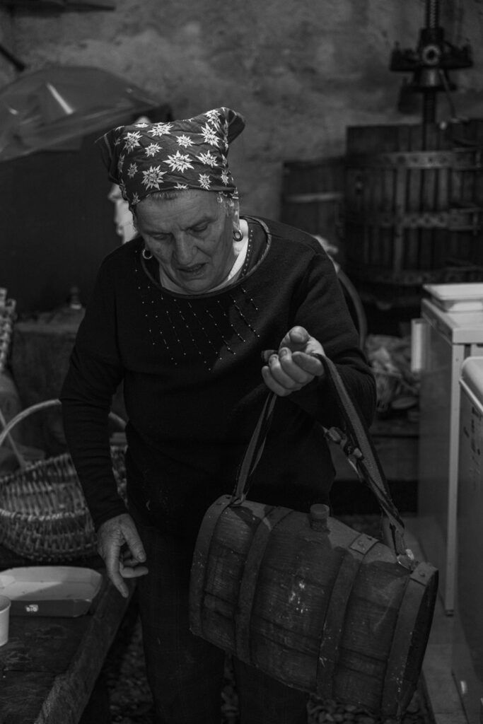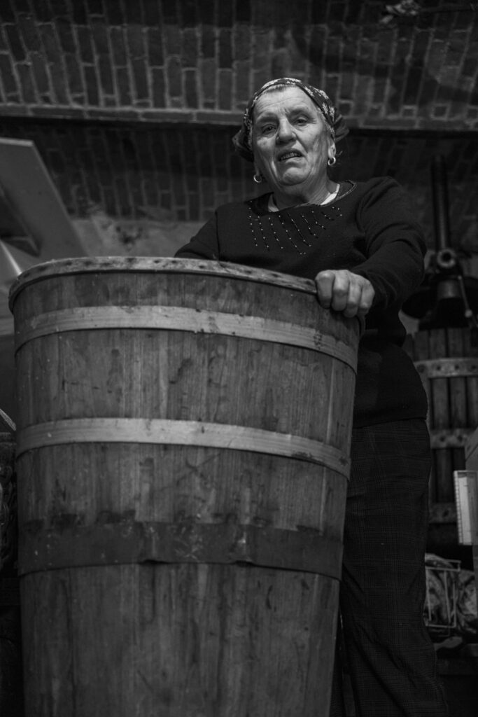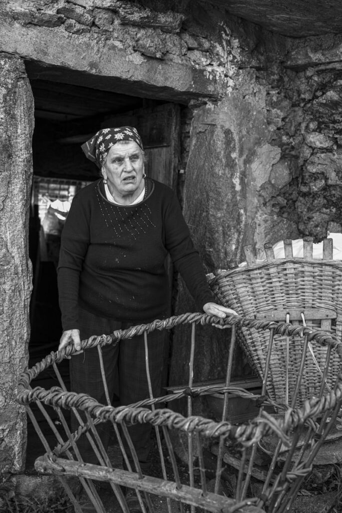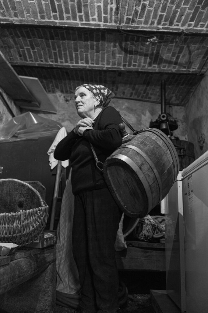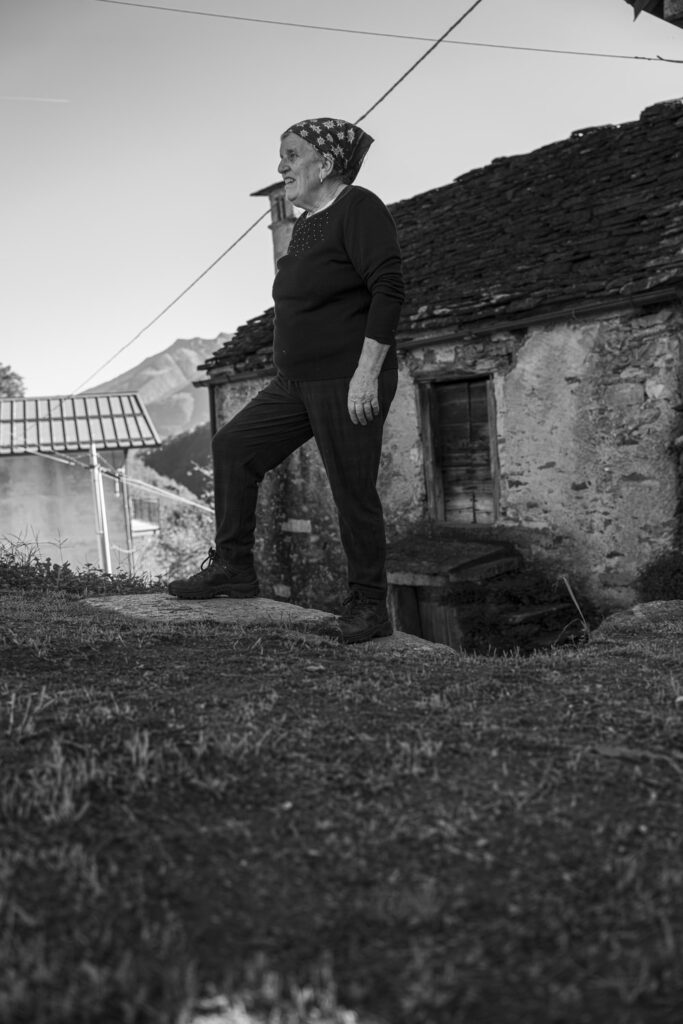 Nel ritratto del mese di luglio, Marina è sulla soglia della sua vecchia stalla, con la caula appoggiata davanti a sé. Indossa un foulard annodato con cura, scarponi consumati dal tempo e dalla fatica, e porta sul volto la calma consapevole di chi ha attraversato le stagioni con coraggio e dignità.