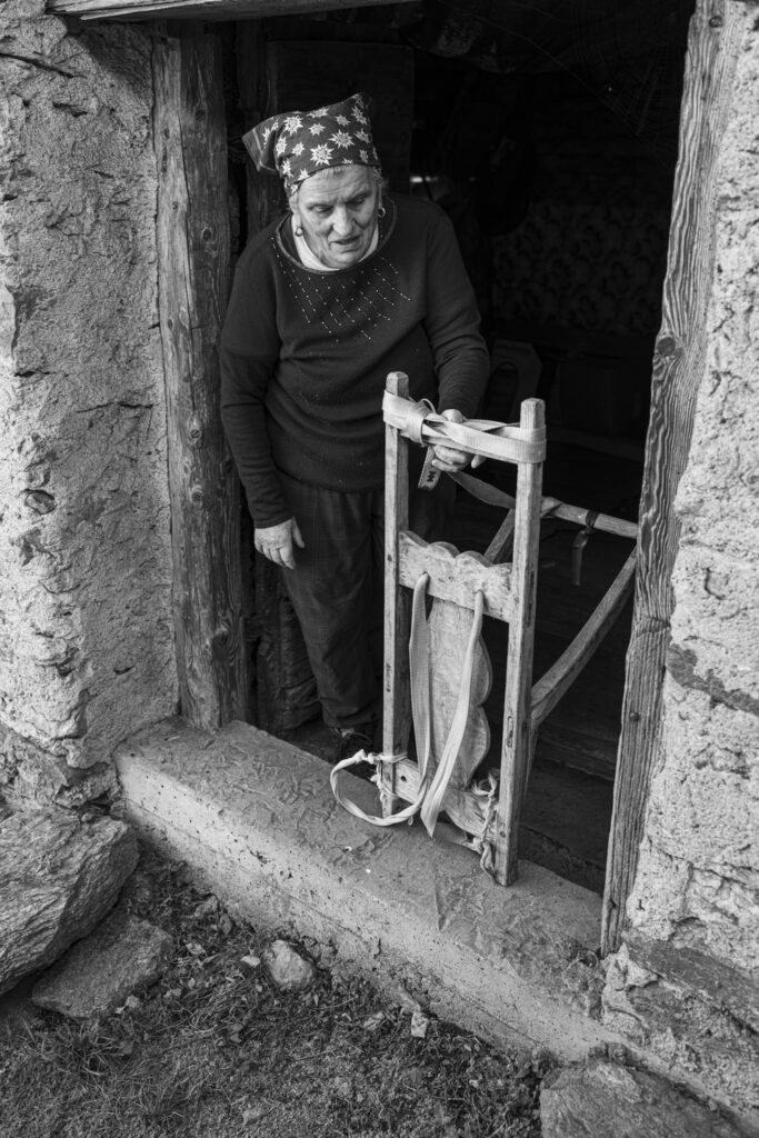 Marina ci ha spiegato che l’alpeggio cominciava a maggio. Allora si saliva a piedi con 25-30 capre, 7 mucche e alcuni vitelli, caricando il necessario nelle gerle o nei basti degli animali.